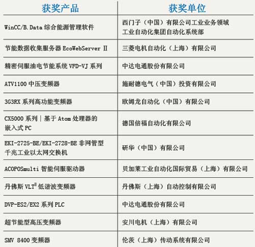 共有12種創新節能產品獲得了“2009年度中國自動化領域創新節能獎”(詳見下表所示)。