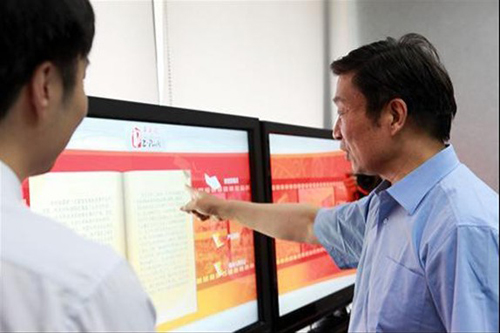 圖為:邁思奇科技公司采用新一代人機交互技術開發的思奇互動讀報機產品,連接IP網絡可以下載更新海量報刊信息,通過手指觸摸操作,可以對顯示的報刊頁進行翻閱、縮放、移動、拖拽、圈注等操作。
