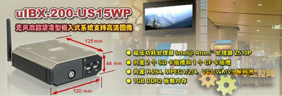 上海,1月21日,2010,全球工業電腦主要廠商威強工業電腦,最新推出無風扇超緊湊型嵌入式係統uIBX-200-US15WP。uIBX-200-US15WP支持Intel@ Atom™ 處理器Z510P 1.1GHz,內置2個SD卡插槽和一個CF卡插槽,1GB DDR2板載內存。超緊湊型及無風扇設計,能夠滿足安靜無噪音的應用環境,如:廣告機播放、圖書館、博物館等。