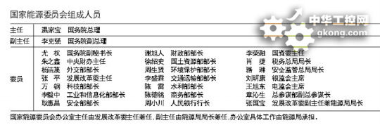 國家能源委員會委員合計21人,其中有國務院副秘書長尤權、中央財辦主任朱之鑫、外交部部長楊潔篪、國家發展改革委主任張平等,均是來自國家發展改革委、科技部、工信部、財政部、國土資源部、環保部、交通運輸部、水利部、電監會等相關部委的負責人。