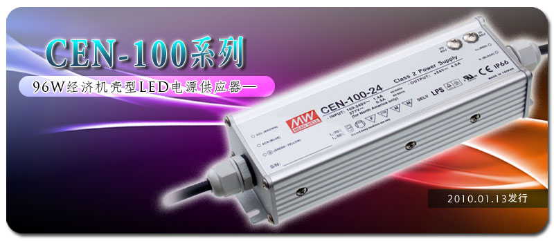 隨著能源成本不斷攀升與地球暖化日益嚴重,標榜綠色節能的LED相關應用日漸盛行,加上近年來全球主要國家亦紛紛針對LED擬定相關發展政策,LED相關應用市場持續升溫中。為了滿足低價位LED照明/裝飾光源與室內外防水照明應用逐漸增加之需求,明緯繼CLG-100係列後新推出了一款96W金屬外殼型、更低價、具主動式功率因數矯正(Active PFC)的高防塵防水(IP66)等級LED電源供應器~CEN-100。本係列設計上透過機構方式來符合IP66之要求,節省了內部灌膠成本,並在線路設計上運用了單級PFC架構,以最經濟的方式達成高PF值的要求,故可維持較低成本。另本係列特別於外殼上另加開兩小孔,讓使用者在不需拆開外殼的情況下可進行調整輸出電壓(±10%)與電流(75~100%)。