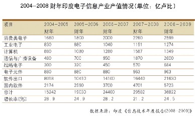2008-2009財年(2008年4月1日到2009年3月31日),印度電子信息產業總產值為36822億盧比(合896.8億美元),較2007-2008財年增長24.5%。產業增長速度較快的原因有兩個:一是產業本身保持了良好的發展勢頭,二是盧比貶值。