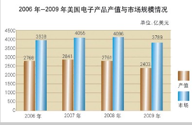 2009年美國電子產品市場規模出現了近幾年的首次下滑,下降了7.5%,市場規模為3789億美元。美國電子信息製造業所有行業市場規模均出現了不同程度的下滑,其中,降幅最大的是電子元器件行業,為17.4%;降幅最小的是醫療與工業設備行業,為0.6%。