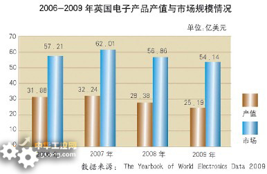 2008年英國電子信息產品製造業產值為28.38億美元,較上年同期下降12.00%;市場規模為56.86億美元,較上年同期下降8.31%。2009年英國電子信息產品製造業產值和市場規模分別達到25.19億美元和54.14億美元,降幅分別為11.22%和4.77%,降幅較2008年收窄。