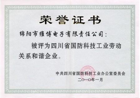 近日,綿陽市維博電子有限責任公司獲四川省國防工辦黨委授予的“四川省國防科技工業勞動關係和諧企業”榮譽稱號。