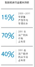 產量:2009年全年金屬切削機床總產量580273台,其中數控金切機床143904台,同比分別降低13.6%和0.5%;成形機床總產量218867台,其中數控成形機床產量9315台,同比分別增長6.1%和16.8%。