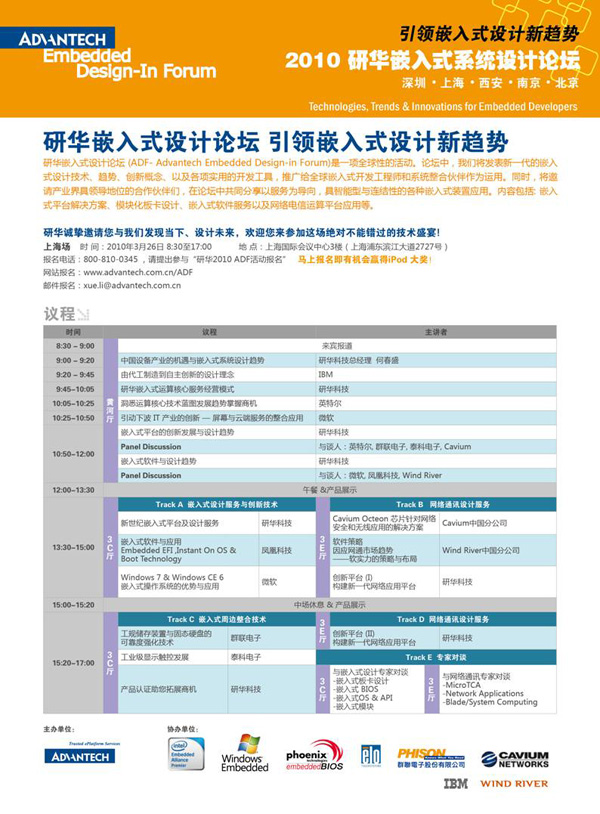 研華誠摯的邀請您參加3月26日在上海舉辦的研華嵌入式設計論壇,2010研華嵌入式設計論壇(ADF-Advantech Embedded Design-in Forum),是一項全球性的活動。論壇中,研華公司將發表新一代的嵌入式設計技術、趨勢、創新概念、以yi及ji各ge項xiang實shi用yong的de開kai發fa工gong具ju,推tui廣guang給gei全quan球qiu嵌qian入ru式shi開kai發fa工gong程cheng師shi和he係xi統tong整zheng合he夥huo伴ban作zuo為wei運yun用yong。同tong時shi,將jiang邀yao請qing產chan業ye界jie具ju領ling導dao地di位wei的de合he作zuo夥huo伴ban們men,例li如ru英ying特te爾er、微軟、IBM、鳳凰科技、Wind River、群聯電子、泰科電子等各領域專家都將與研華一起在論壇中共同分享以服務為導向、具智能型與連接性的各種嵌入式裝置應用。內容包括:嵌入式平台解決方案、模塊化板卡設計、嵌入式軟件服務以及網絡電信運算平台應用等。