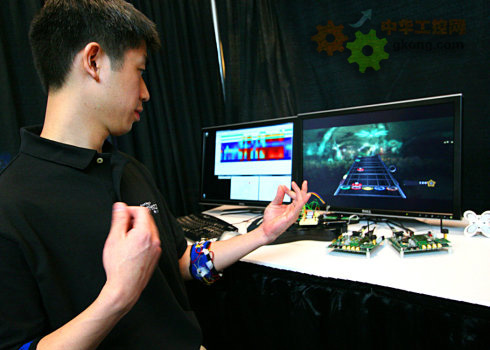 微軟公司一直致力於研究利用傳感器等元件來實現新穎的並具有較強交互感的物理設備。微軟亞洲研究院的人機交互組負責人Desney Tan博士展示了一項最新技術——將手臂的運動直接作為鼠標來使用——依賴於肌肉的運動和變化來“指揮”計算機進行各式各樣的交互體驗。隻要在手臂上戴上傳感器,可以“握”著電腦中的吉他自如地彈奏起來。在空中輕輕揮動手指,計算機便可以跟蹤運動手指的軌跡等等。