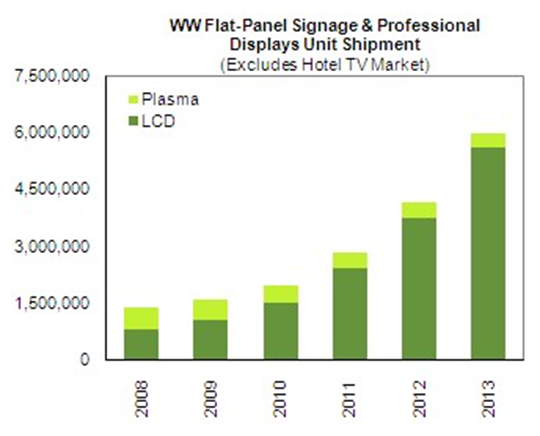 2010年全球液晶顯示器和等離子屏幕等數字標牌媒體數量可能增長25%,達到199萬台(2009年統計為160萬台),據統計機構iSuppli最近披露。