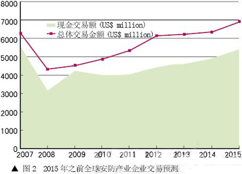 在圖1中,展示了自2000年至2009年全球安防產業企業之間交易的數量變化,圖2則是對於2015年之前安防產業企業交易的預測。展望未來,預期在下一個十年的前半段,完成的企業並購交易值將會增長50%。這看起來似乎有點太樂觀,因為根據預測,2010年僅會有小幅的增長。但實際上,2015年相比2007年企業間的交易總量僅會增加10%,而後者卻是近些年來發生企業並購案最多的一年。