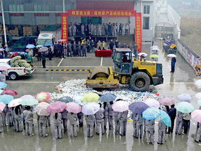 3月15日,在國際消費者權益日來臨之際,德力西集團市場保護中心在電氣公司門口舉行了假冒產品銷毀現場會。集團領導、施耐德電氣(中國)投資有限公司代表等共200餘人參加並觀摩了整個銷毀過程。