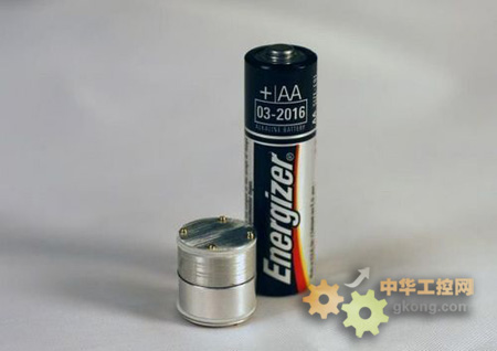 由密歇根大學無線集成微係統工程技術研究中心創造的微型發電機(旁邊是一個典型的AA電池),通過我們身邊的隨機振動發電。