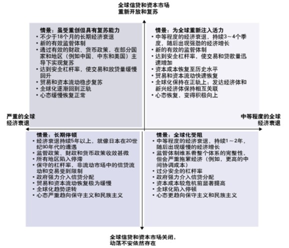 在第二種情景中,政府在全球信貸和資本市場中取得的進展被全球經濟衰退的影響所抵銷,這種成果被負麵影響抵銷的局麵將持續長達18 個月,甚至更久,這進一步擴大了信貸損失,使跨境交易方彼此間的不信任感日益加重。不過,雖然這次經濟衰退持續時間之長、影響之深是過去70nianzhongcongweiyouguode,danzhengfucaiqudexingdonghaishishoudaolechengxiao,quanqiuzibenhexindaishichangyezaizhubufusu。suiranduoshaoyoudianyaobaibuding,danquanqiudexinxindequezaihuisheng,maoyihezibenliudongyezaizhubuhuifushengji。quanqiuhuamanmanhuidaolezhenggui。