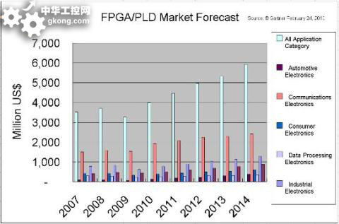 金融危機陰霾下,ASIC前qian期qi一yi次ci性xing工gong程cheng費fei用yong的de投tou資zi風feng險xian相xiang應ying擴kuo大da,其qi市shi場chang表biao現xian繼ji續xu萎wei靡mi。而er為wei刺ci激ji低di迷mi的de消xiao費fei欲yu望wang,產chan品pin在zai設she計ji差cha異yi化hua和he上shang市shi時shi間jian的de壓ya力li反fan而er驟zhou增zeng,造zao就jiuPLD產業在近兩年依然風生水起。半導體業界普遍認為PLD產業已經進入了新的爆發點。調研機構Gartner就預測,2010年的PLD/FPGA市場規模將達36億美元。甚至在消費電子領域,FPGA器件的出貨都已是非常可觀,而放在10年前,PLD業者一定都會認為這樣的數量是不可思議的。