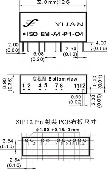 此產品是一種混合集成電路。主要用於工業控製係統中模擬信號輸入輸出控製,係統內部通過DSP、PLC的DA轉換輸出信號來顯示和控製其它裝置的可調輸出,現場工作電壓、電流和各種運行參數的監測及係統外部增加4-20mA(0-20mA)/0-5V標準信號接口等。該IC為標準Sip12 Pin符合UL-94的阻燃封裝,占用PCB板麵積少,裝入儀器內部可以並聯安裝實現多路信號的監測、隔離和轉換。IC在同一芯片上集成了一個多隔離的DC/DC變換電源和一組模擬信號隔離放大器,輸入及輸出側寬爬電距離及內部隔離措施使該芯片可達到3000VDC絕緣電壓。Sunyuan ISO EM係列產品使用非常方便,免零點和增益調節,無需外接調節電位器等任何元件,即可實現工業現場信號的隔離轉換功能。