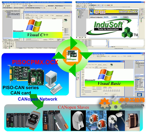 CANopen是一種架構在CAN bus網絡上的通訊協議,主要應用在嵌入式係統網絡中的機器控製。例如,工業機具控製、飛機引擎監控、工廠自動化、醫療設備控製、大樓自動化、遠程數據收集和控製、環境監測等等。泓格公司提供CANopen 控件組件(PISOCPMX.OCX)供PISO-CAN係列CAN卡使用。使用者可以運用PISOCMPX在PISO-CAN係列CAN卡上自行開發CANopen主端的應用程序。這套開發工具不僅可以幫助使用者更容易快速建立CANopen係統的網絡,且能有效地縮短開發時間,更可以與泓格公司或其它廠牌CANopen的產品建立CANopen網絡係統,其應用架構如下所示: