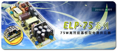suizhenengyuanjiagegaozhang,huanbaoyishitaitou,shichangduiyudianzixiangguanchanpinjienengdeyaoqiuriyiyanke,weileyinyinghuanbaolvnengdeshijiequshiyufuheweilaishichangduidihaonengchanpinzhiyaoqiu,mingweituichulexinyidai75W高效率低耗能之交流/直流基板型電源(AC/DC open frame type power supply) ~ ELP-75係列。本係列主要鎖定不需電源機殼可內置於係統機箱內之低價應用,相較於第一代長條型基板式機種LPS-75係列,ELP-75工作效率平均提昇了5~11%,空載待機損耗<0.5W之優異節能特性可應用於各式綠色節能考量的係統設計。