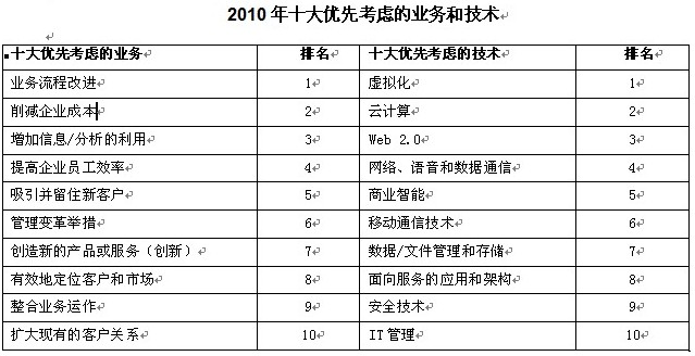 Gartner集團副總裁兼Gartner EXP調研主管Mark McDonald 表示,隨著經濟從衰退過渡到複蘇,企業的戰略也從削減成本、提高效率轉型到創造價值、提高生產力上。而技術也正從“重”所有者經營的解決方案轉型到“輕量”服務上。CIO不僅僅要管理IT資源,更要擔負起管理業務結果的重大責任。與此同時,CIO也把2010年看作是加速IT從支持的角色向成為側重革新和競爭優勢的策略貢獻者轉型的一年。