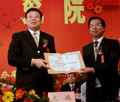 來自清華大學機械工程學院院長、教授尤政(左)擔任首任院長。圖為邗江區委書記程裕鬆(右)向尤政頒發聘書。