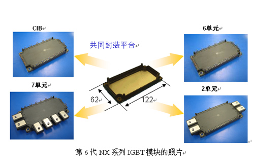 實驗表明新型矽片具有足夠寬SCSOA和最少10μs的短路承受時間。第6代IGBT模塊的NX係列模塊采用第6代矽片,最大允許結溫可高達175°C。 采用第6代NX係列IGBT模塊的變頻器功率損耗比傳統產品的降低約20%。例如:1200V/150A IGBT模塊應用於30kW的變頻器,功耗可從200W減少到160W(CM150TX-24S與CM150DX-24A對比)。