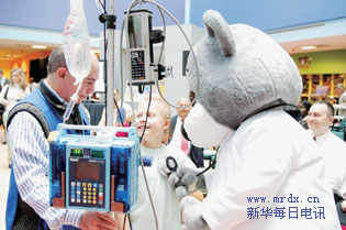 ▲美國全國兒童醫療中心的“小熊醫生”在為一名兒童“診病”。(資料片)