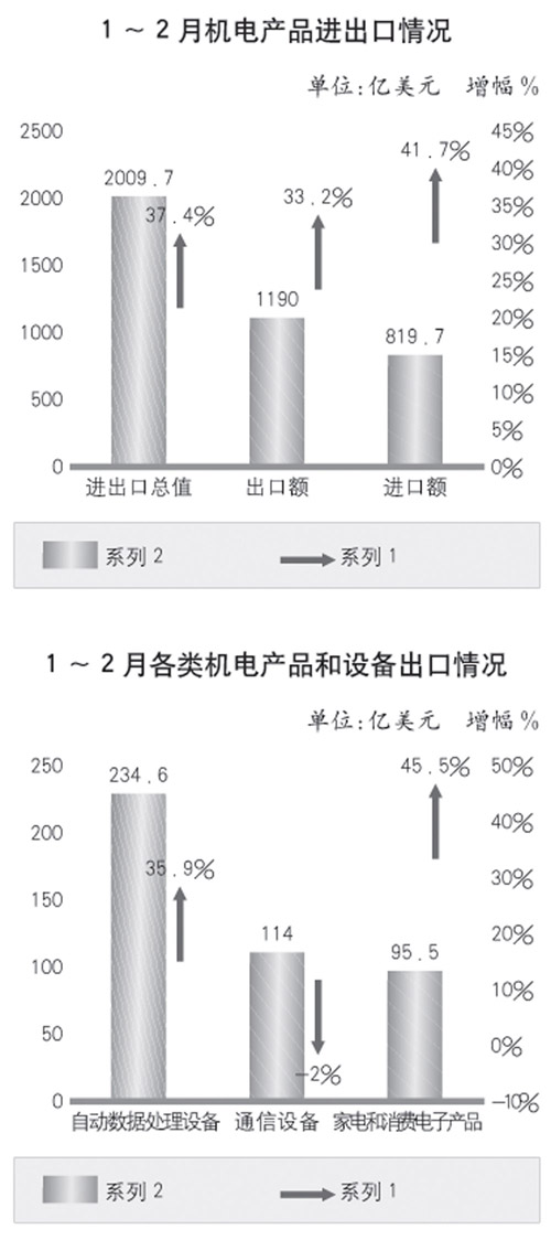 1~2月份一般貿易出口額為375.5億美元,增長39.1%,占機電產品出口比重的31.6%;進口額310.8億美元,增長51.2%,占進口比重的37.9%。