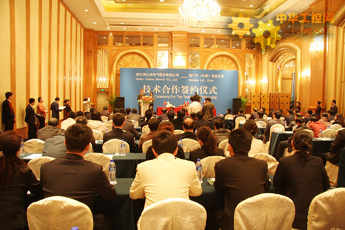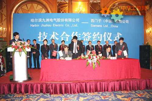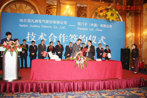 4月27日,哈爾濱九洲電氣股份有限公司與西門子(中國)有限公司在哈爾濱香格裏拉酒店隆重舉行技術合作簽約儀式,從此,九洲電氣將成為西門子在中國指定的“最新型40.5KV 8DA、8DB氣體絕緣中壓開關”和“SIVACON -8PT低壓開關”設備生產製造商,擁有了這兩項產品的生產製造權和銷售權。哈爾濱市委常委、副市長叢國章等領導蒞臨現場共同見證了簽約儀式。