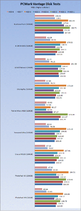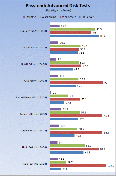 在常用的Windows應用環境測試下,RunCore Pro V 在各項目中均超過了平均水平。對Windows用戶而言,這些測試項目準確地告訴了我們各種硬盤在作為引導盤時的表現,並且這些盤都是從一般的電腦愛好者那裏可以找到的。