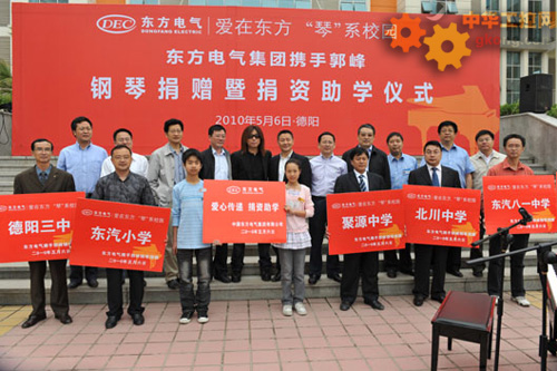 5月6日,“東方電氣集團攜手郭峰鋼琴捐贈暨捐資助學儀式”在四川省東汽八一中學隆重舉行。集團公司黨組副書記、總經理斯澤夫,集團公司黨組副書記、常務副總經理張曉侖,集團公司董事會秘書、辦公廳主任張林超,四川籍音樂人郭峰,德陽市副市長肖龍溪,德陽市教育局局長彭勇,東汽八一中學、北川中學等十所受贈中小學的代表出席了捐贈儀式。