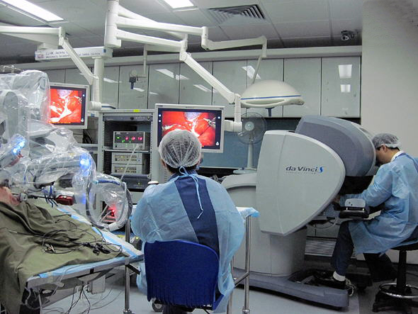 患者全身麻醉後,醫生在其腹壁上打了4個直徑為1厘米的小孔,機器人的4個機械臂通過這些小孔插入患者腹腔內,這時,手術視野圖像通過機械手臂被放大20倍,在監視器上顯示出來。