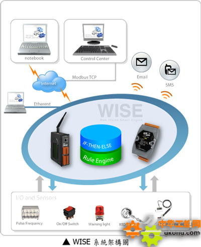 WISE控製器中內建了一個規則執行引擎(Rule Engine),用以檢查使用者的工作程序規劃是否正確成立,並執行相對應的動作。例如:設定IO channel值、執行Timer/Schedule的時序控製或發送Email及SMS等。此外,WISE也可通過Modbus TCP protocol與SCADA 軟件聯機,實時監控控製器上的IO和係統信息。