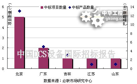 在招標采購地區方麵,北京在2010年1季度我國DCS設備國際招標市場中表現相對較為活躍。北京地區的中標項目數量達到5個,中標產品數量也超過10台,均位於首位,且遠超其他地區。