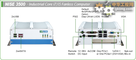 采用 32nm Intel Core™ i7/i5 處理器, NISE 3500係列無風扇PC基於Intel Turbo Boost 和 Intel Hyper-Threading 技術 (2 cores, 4 threads), 以及基於處理器的圖形性能和2個DDRIII 800/1066 可打4GB的內存模塊。Intel Turbo Boost 技術提供了一種處理器內核上的時鍾速度的加速需求,當其他的核心的利用較少時。NISE 3500 無風扇PC集成圖形加速,支持高達1080p分辨率的高清視頻播放,並支持多種顯示接口,包括1個 VGA,1個 DVI-I (DVI + VGA),內嵌的雙通道的18/24-bit LVDS和可選的 HDMI 輸出。板載Intel 82577LM GbE LAN 控製器提供高速的網絡傳輸速率,遠程管理能力。基於Intel Active 管理技術 6.0, NISE 3500 series 無風扇PC可以通過KVM 定向進行遠程網絡管理性能進行輕鬆的監控和通訊,通過網絡,服務器和用戶提供最優化的係統遠程管理性能。