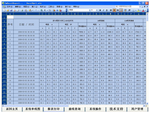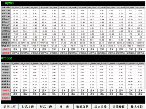 係統二級主頁麵,頁麵上顯示出每個站點的進線出線有功功率及誤差、誤差比,點擊可以進入係統但線圖。點擊頁下側的標題按鈕進入相應的功能菜單或執行相應的功能