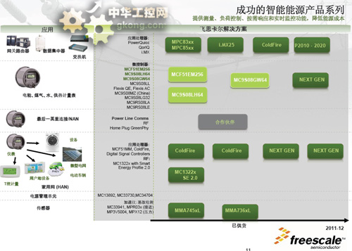 作為設計和製造嵌入式半導體產品的廠商,飛思卡爾始終將“讓世界更加智能”作為其發展嵌入式解決方案的核心理念,致力於在智能能源市場中獲得成功,提供一係列硬件、軟件支持和參考設計平台,為用戶提供安全的下一代能源解決方案。下圖為飛思卡爾智能能源產品係列。