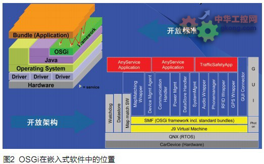 第二,嵌入式係統要網絡化。假如現在就把互聯網複製到物聯網,這在技術上是行不通的,因為我們麵向對象是數據,是連續的、動態的、是非結構化的。所以瀏覽就不能簡單地設為嵌入式瀏覽器,因此需要在低端和高端之間建立信息中間件,OSGi (Open Service Gateway initiative)應運而生(圖2),是開放性的機構,專門針對汽車電子、家庭網絡、移動設備和工業環境等特定領域的互聯網中間件的應用。例如,OSGi聯盟專門成立了一個名為汽車專家組(Vehicle Expert Group)的特別機構,為OSGi在汽車電子領域的應用製定規範 。