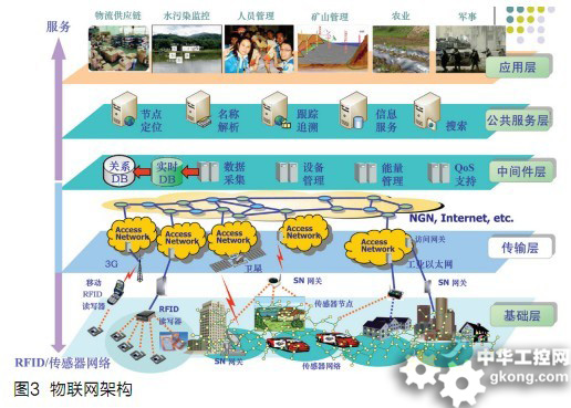 技術層包括以下幾類(圖3):RFID標簽、讀寫器等基礎設備,還有傳感器、傳感器網絡、傳感設備。傳輸層(這也是ITU重新定義物聯網的原因)主要是在網絡層考慮,從網絡技術、通信技術去考慮。我國提出利用3G去傳輸物聯網,但這裏還是涉及許多問題,比如信息終端,還有現在的操作係統,像中國移動推出的OMS操作係統,如果真正涉及到基礎設施,還有工業以太網、交通、離散控製領域等特殊的網絡,當然基礎設施上還有一些軟件的工作,比如中間件、中間件的功能、實時信息處理、海量的數據怎麼處理。如果實現物聯網應用,一定要正開環,因為開環要為公共服務,涉及到更多的問題。