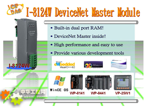 I-8124W內建CPU與dual-port RAM,由於擁有這個特性,它不僅能降低WinPAC或ViewPAC CPU的工作負擔,更能在DeviceNet網絡中實時地通訊。為了適應各項開發工具,本產品還提供embedded Visual C++ 4.0與C# .NET等範例程序可以幫助使用者更快速的上手使用本產品。使用者可以建構多樣化的DeviceNet控製係統,即使您的感測與驅動組件是不同的通訊協議,也能使用泓格公司的DeviceNet slave與gateway產品輕鬆整合。