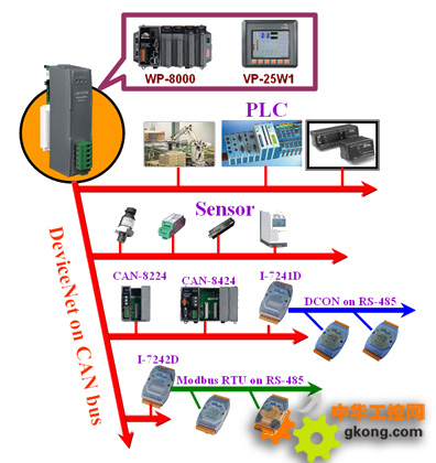 DeviceNet是一個簡單的而且開放式的網絡解決方案,能有效地降低配線成本,節省安裝設備的時間。通過標準的DeviceNet通訊協議,使用者可以將不同廠牌的DeviceNet slave設備快速地整合在同一個網絡中。泓格公司的DeviceNet master產品,I-8124W模塊,能為WinPAC或是ViewPAC控製器擴充一組單端口的DeviceNet master通訊界麵。結合WinPAC或ViewPAC的優勢,I-8124W更能表現出它高效的控製方式與彈性的應用架構,以下將向大家展示一個典型的網絡架構。