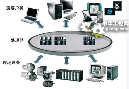 這種3層式的係統體係架構,包括了現場設備、處理器及表示層,而表示層采用了一種瘦客戶機(圖4)。