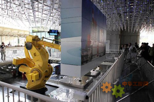5月12日,機器人“發那科”在上海企業聯合館展示拚好的圖案。