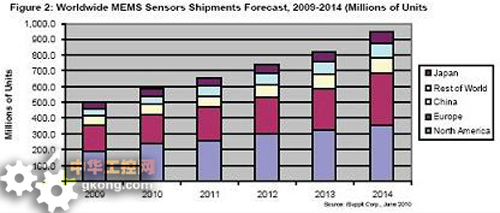 鑒於中國汽車出貨量迅速增長,在該地區已經建立據點的供應商,如Bosch和Continental,都逃過了經濟衰退的最嚴重影響。2009年中國市場占總體MEMS消費量的11%,未來幾年將繼續增長,到2014年將成為全球第三大市場,領先於日本和“世界其它地區”。iSuppli公司認為,這些動態未來五年對於MEMS傳感器供應商來說是好消息。