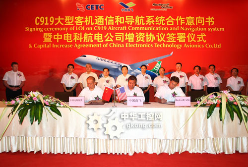 6月26日,中國商用飛機有限責任公司、中電科航空電子有限公司以及美國羅克韋爾柯林斯公司共同簽署國產C919daxingkejitongxinhedaohangxitonghezuoyixiangshu,biaozhizhewoguoguochandaxingkejitongxinhedaohangxitongdegongyingshangxuanzeheguoneiwaigongyingshanghezuoqudezhongdajinzhan,zhongdiankehangdiangongsijiangzuoweiguochanC919大型客機通信和導航係統的國內供應商,與柯林斯公司組建合資企業共同承擔C919項目通信和導航係統任務,並為國產ARJ21飛機、MA600飛機提供本土化生產的通信和導航係統設備及其他產品。同時,中國電子科技集團公司與四川省、成都市和高新區政府簽署中電科航電公司增資協議,標誌著中國電子科技集團公司與四川省、成都市和成都市高新區政府為國家大飛機重大專項的戰略性投資合作取得了重大進展。