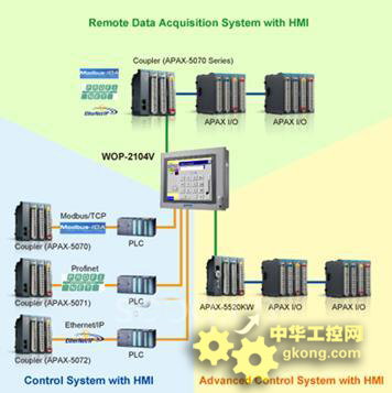 在一般的控製係統中,人機界麵可以和PLC控製器相連接,來完成機電自動控製任務,如工廠裝配生產線上的機械控製或過程控製。研華推出了耦合模塊APAX-5070/5071/5072來擴展現有PLC係統中的I/O,它可以通過不同的協議連接APAX I/O與PLC,例如Modbus/TCP, Profinet and EtherNet/IP。PLC用戶可以通過原始的PLC開發軟件輕易地使用APAX I/O,現有的PLC係統可以輕易地通過APAX-5000遠程輸入輸出係統增強靈活性和可擴展性。