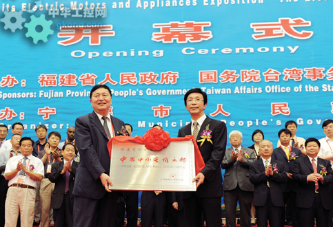 圖為在首屆海峽兩岸電機電器博覽會暨十一屆寧德投資洽談會開幕式上,中國機械工業聯合會執行副會長楊學桐(前排左一)向福安市市長楊培欽(前排右一)授予“中國中小電機之都”牌匾。(李民雄 攝影)