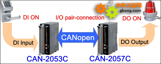 CAN-2053C可和另一CAN-2000C係列的DO模塊(例如CAN-2057C)搭配成CANopen的I/O pair-connection網絡