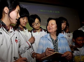 圖:6月9日,中科院數學物理學部與北京青少年科技俱樂部共同組織“科普進校園”係列活動,中科院院士、著名天文學家葉叔華在北京第二中學舉辦“我國大型天文儀器展望”專題講座。這是講座結束時,葉叔華院士與中學生們交流。