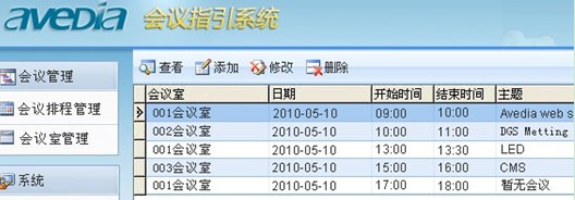 該會議指引係統主要分為會議管理和係統兩部分,不同權限的用戶可以查看、添加、修改各會議室的排程和參會的人員。管理員還可以對播放的設備進行基本的遠程開關機硬件管理。可見,Avedia會議指引係統彌補了多媒體信息發布係統不能隨意管理會議排程、會議室的缺點。