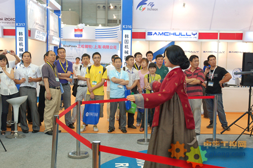 韓國機器人表演在往年展會上就引起人們的廣泛關注,今年的機器人秀由一個真人大小、外表逼真而清新可人的機器人女模特擔當,其表演的歌舞,展現了韓國悠久的文化傳統和現代機器人技術,令現場觀眾拍案叫絕。