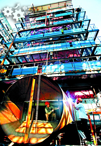 圖為工人在焚燒爐外安裝輔助設施。